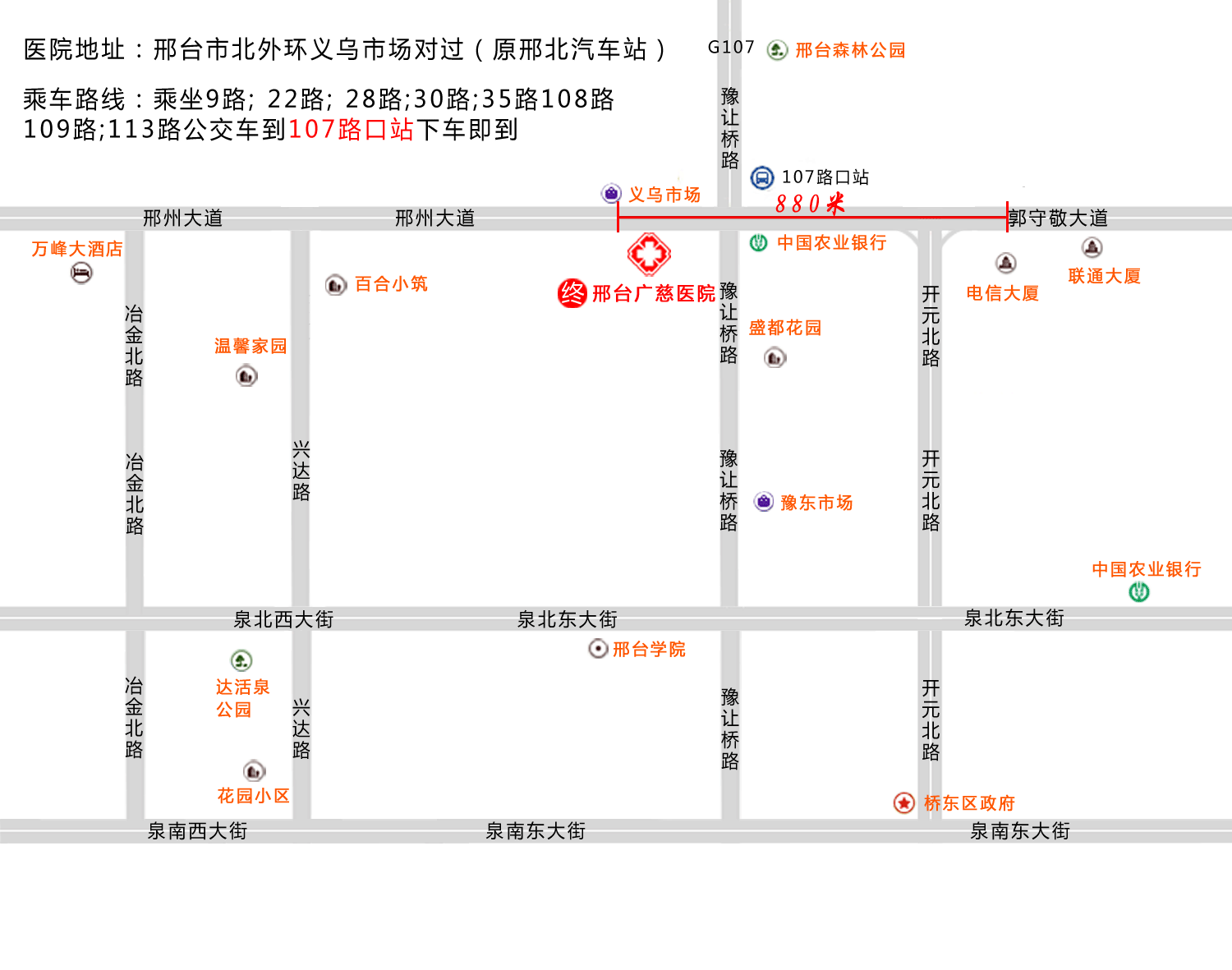 乘坐108路、109路到107路口下车,南行(红绿灯方向)100米,十字路口西南角即到。